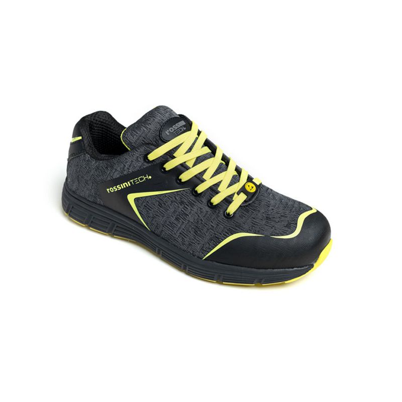 Calzatura bassa dal peso leggero, metal free, solo 440 grammi, in esclusivo tessuto alta tenacità traspirante di colore grigio con applicazioni di colore giallo fluo.
