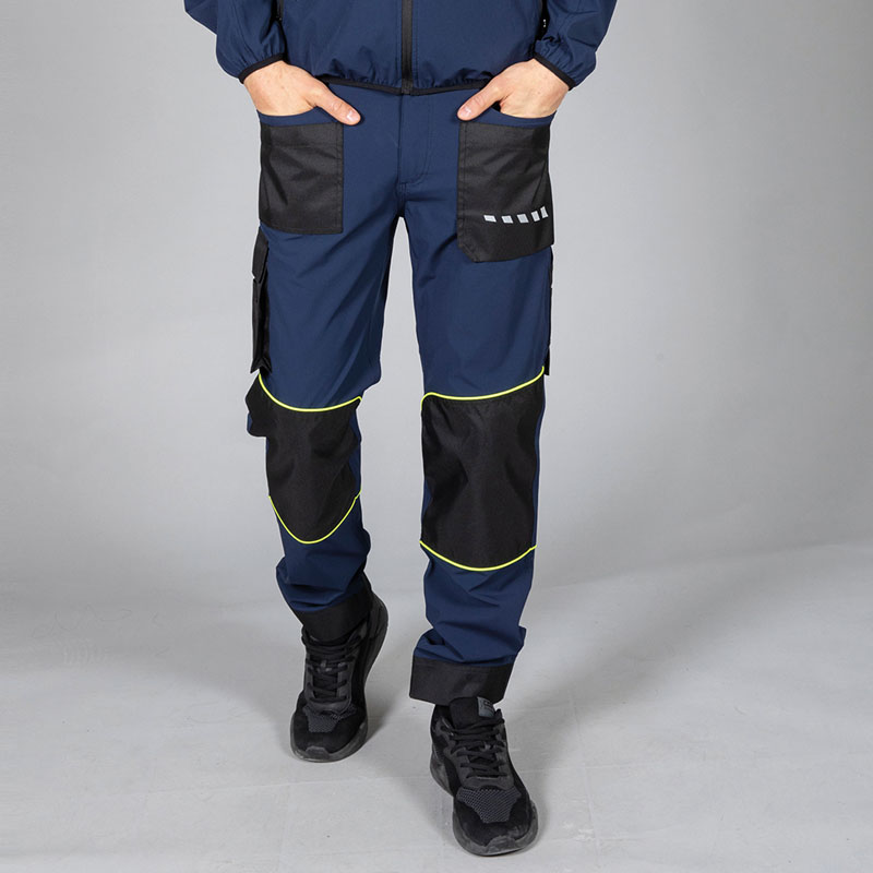 - Tessuto antistrappo sulle ginocchia con piping giallo fluo